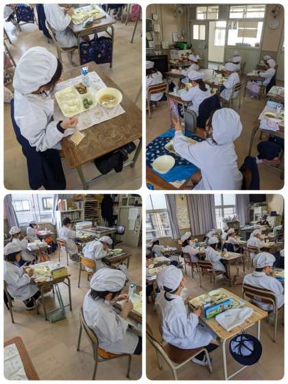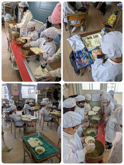 きな粉よもぎだんごは、焼き物機で蒸し、タレをからませ、食べる時にきな粉をかけていただきます。春を感じる献立の一つです。きな粉が美味しかったらしく、「もっときな粉出して欲しい!」とリクエストがありました。