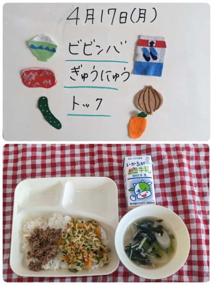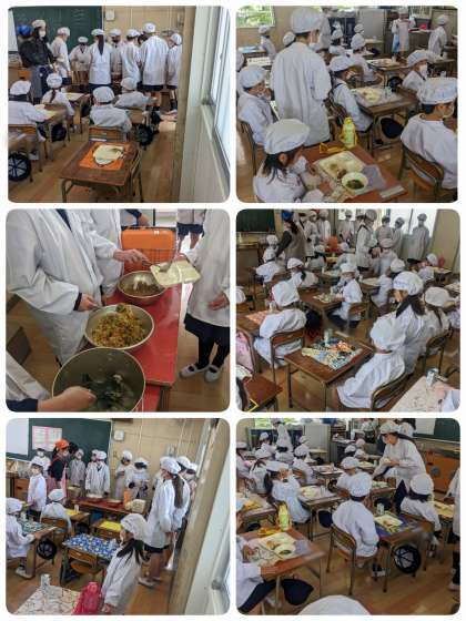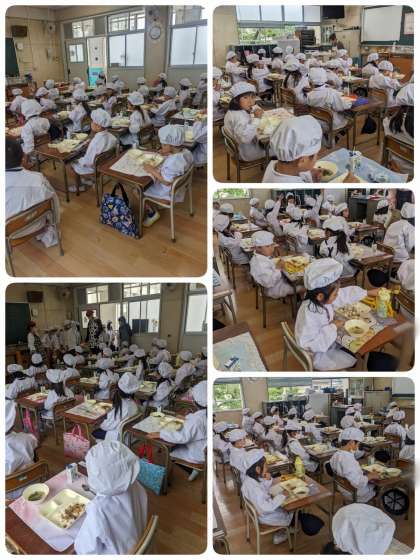 1年生も給食が始まって1週間たちます。6年生のお兄さん、お姉さんが給食のお手伝いにきてくれています。席までお兄さんやお姉さんが運んでくれてとてもうれしそうです。給食もおかわりをいっぱいして残さず食べています。