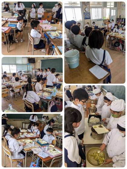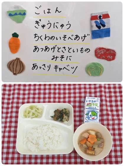 ちくわのいそべあげは、あげ衣にのりを混ぜたり、材料にのりを巻いて衣をつけて揚げる料理のことを「ちくわのいそべあげ」と言うそうです。給食では、ちくわに青のりを加えた衣をつけ、からりと揚げています。