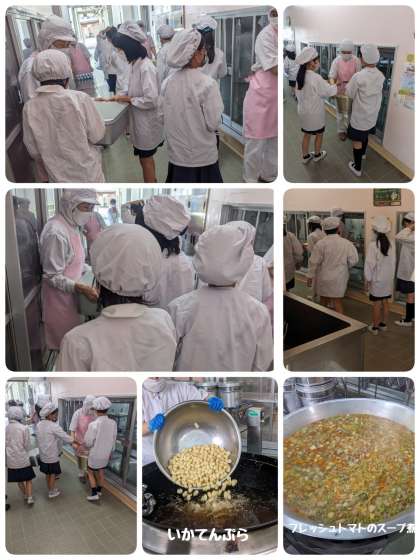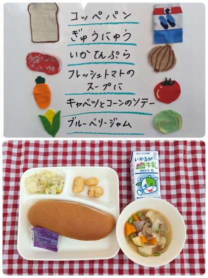 フレッシュトマトのスープ煮は、鶏肉で旨味を出し、今月1回だけ使用できる生のトマトを使い、じゃがいも、たまねぎ、にんじん、むきえだまめ、マッシュルームを使用した洋風の煮物です。生のトマトの酸味でさっぱりとした煮物になっています。