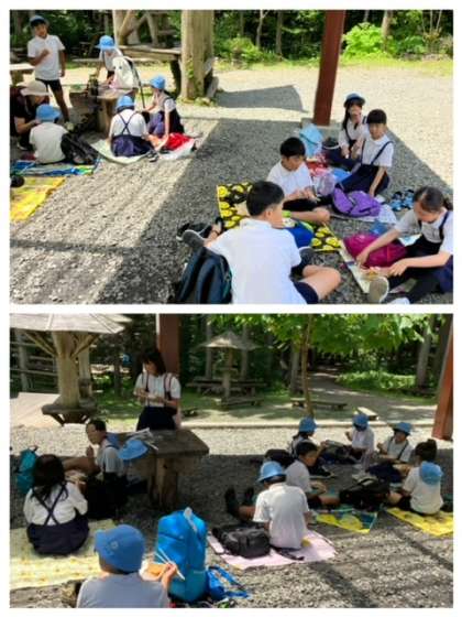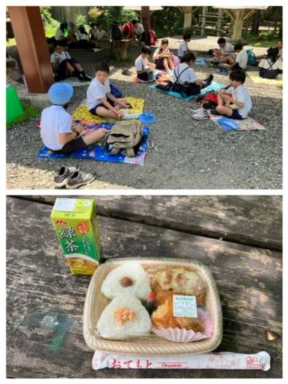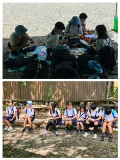 お昼ご飯は、お弁当をいただきます。涼しい木陰でグループ毎に食べています。