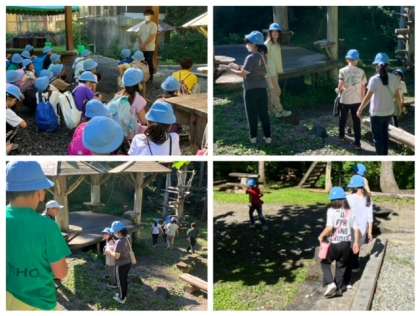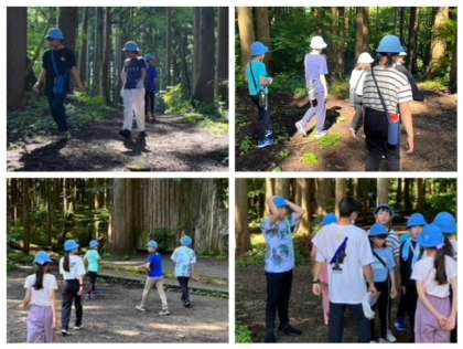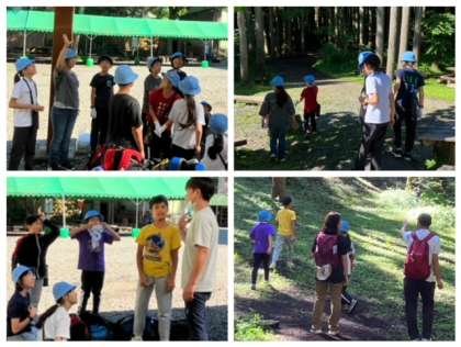 食材探しオリエンテーリングをしています。野外炊飯で作るカレーライスの食材カードを班で探します。