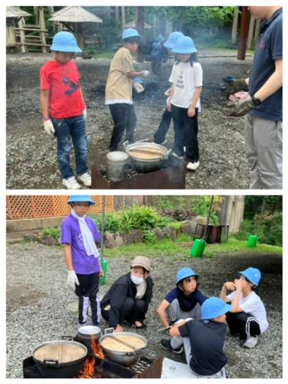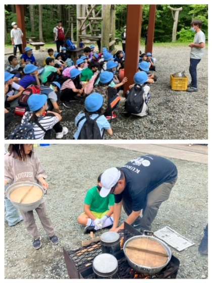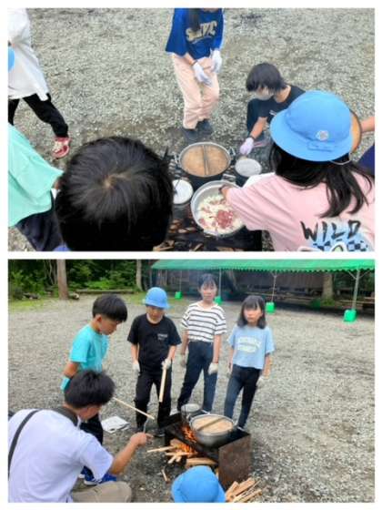 自分たちのカレーライスを自分たちで作っています。火を起こしたり、食材を切ったりして、協力して美味しそうなカレーライスの出来上がりです。