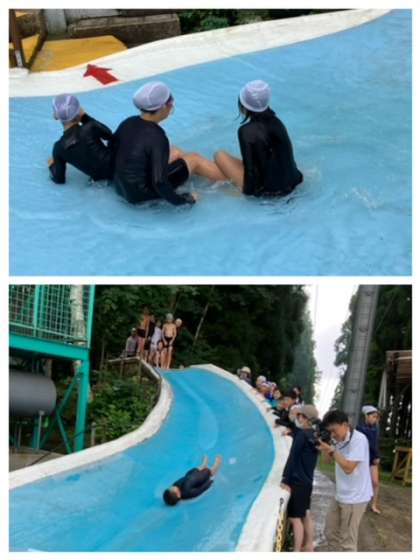 ウォータースライダーは、池の横にある滑り台で、水が流れてよく滑ります。