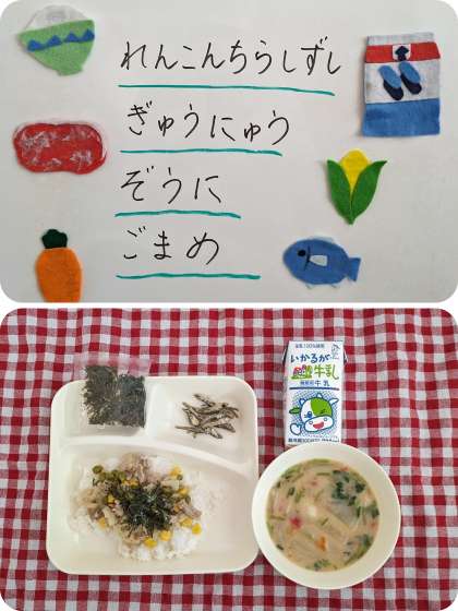 れんこんのちらしずしは、豚肉、れんこん、グリーンピース、コーン、かんぴょうを使用し、こんぶ(粉末)を加えて旨味を増した混ぜご飯です。食べる時に混ぜ合わせきざみのりをかけて食べます。