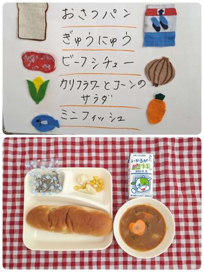 牛肉、じゃがいも、たまねぎ、にんじん、青みにグリーンピースを使用し、小麦粉とサラダ油で褐色になるまでじっくり炒めた手作りのルウでとろみをつけています。デミグラスソースや、とんかつソース、ケチャップ等を使用し、旨味とコクのあるシチューに仕上がっています。