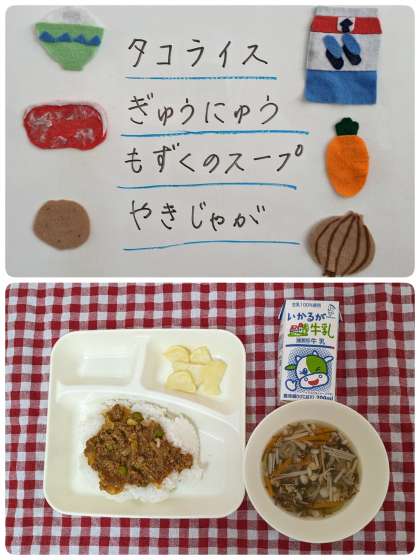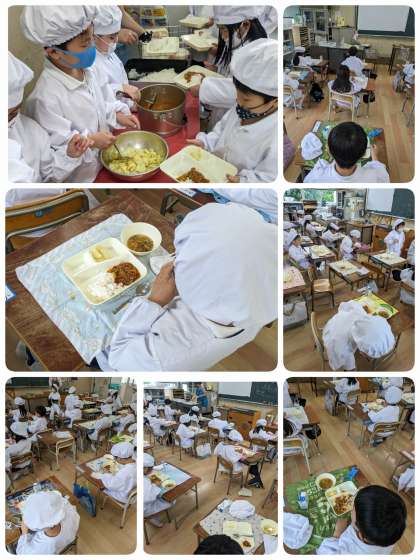 給食が始まって1ヶ月がたち、1年生も自分たちで一生懸命配膳をがんばっています。