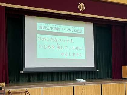 というお話。二つ目は作文を紹介し、三つ目は6年生の代表児童が壇上で「いじめゼロ宣言」を行いました。他の学年もこれらを聞き、学級に帰ってから、自分のいじめゼロ宣言を考えました。
