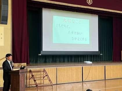 校長先生より、一つ目はいじめについての話を聞きました。いじめは人間の脳の「眠る食べる息をする」を司る部分を攻撃するので、命を落とすかもしれない。絶対にいじめはゆるしません!