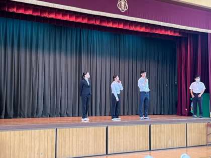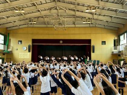 今日の児童集会では、運動委員会の皆さんが、来週から始まるプール水泳の前後に行う体操を教えてくれました。