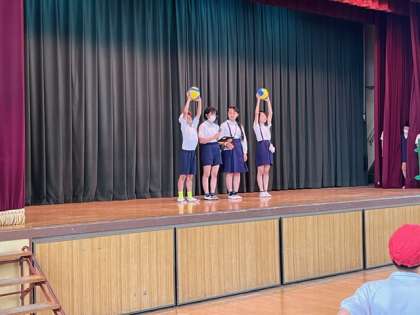また体操の後は、児童会の皆さんが、昨年度回収したベルマークで交換したボールの紹介がありました。皆さんのご協力のおかげでいただけたボールです。大切に使いましょうね。