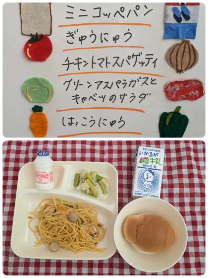 「チキントマトスパゲッティ」は、鶏肉、ウインナーを主材に、たまねぎ、トマト(缶)、にんじん、ピーマンを使用し、バジルで風味をつけたトマト味のスパゲッティです。