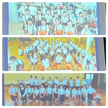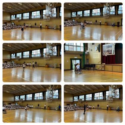 児童代表の挨拶のあと、網本選手にパフォーマンスを見せていただき、6年生のミニバスに参加する児童とフリースロー対決をしました。