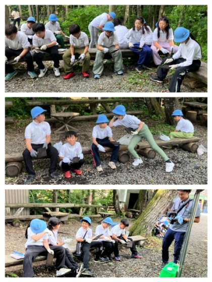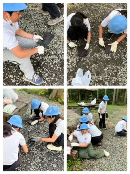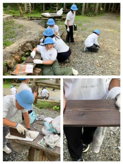 子ども達は、歯ブラシと布で、焦げ目が取れるまで一生懸命磨いています。綺麗に磨けた焼き板は、明日に絵付けをします。