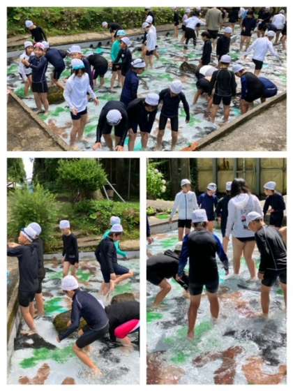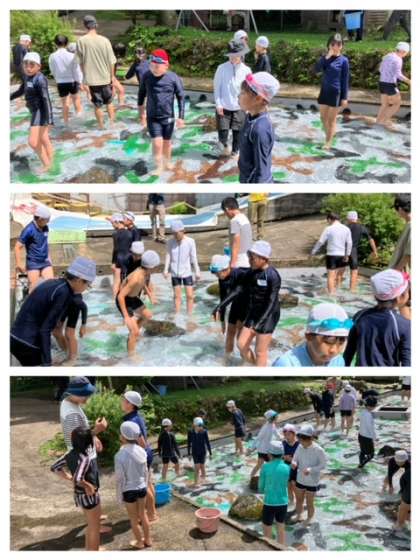 午後の活動は、水着に着替えて、魚つかみとウォータースライダーです。