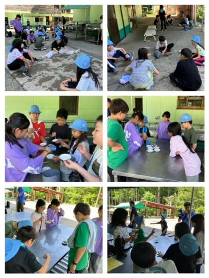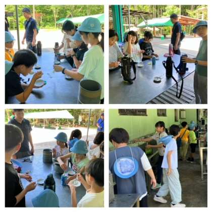 缶の中にできたアイスクリームを班で分けていただきました。協力して作ったアイスクリームを喜んで食べました。