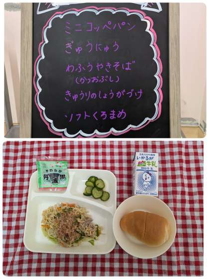 「和風焼きそば」は、豚肉を主材に、塩、こしょう、うすくちしょうゆ、こいくちしょうゆで味付けしています。食べる時にかつおぶしをかけていただきます。