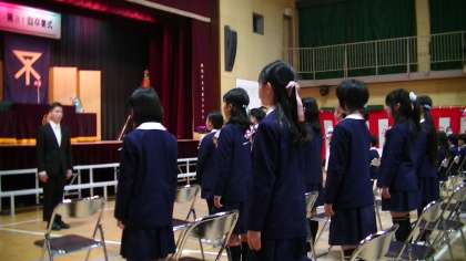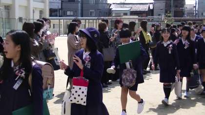 担任との最後のお別れの後は晴れやかな表情で花道を通りました。