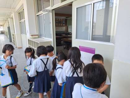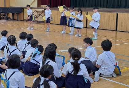 まず講堂に集合し、2年生代表児童が注意点等を発表しました。