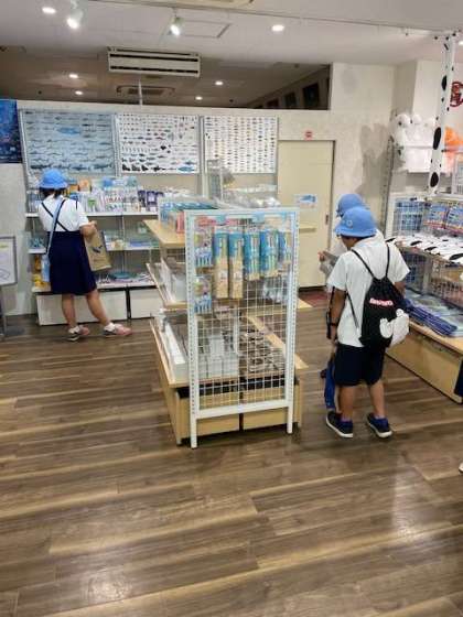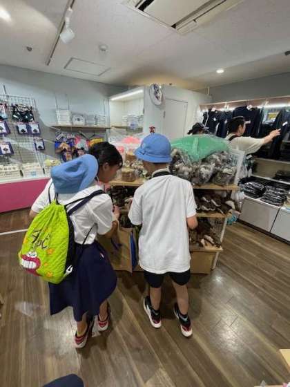 今、お土産を見ています。これは、○○に、これはきょうだいにと一生懸命考えて買い物をしています。優しい東田辺っ子たちです。