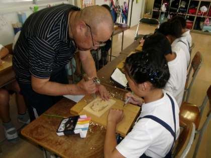 5年生が伝統芸能にふれるために欄間体験をしました。大阪の欄間協会から、7名の方が来て、子どもの体験を指導してくださいました。子どもたちは、兎と月の欄間を一生懸命彫っていました。きっと自分が彫った作品をいつまでも大切にしてくれると思います。