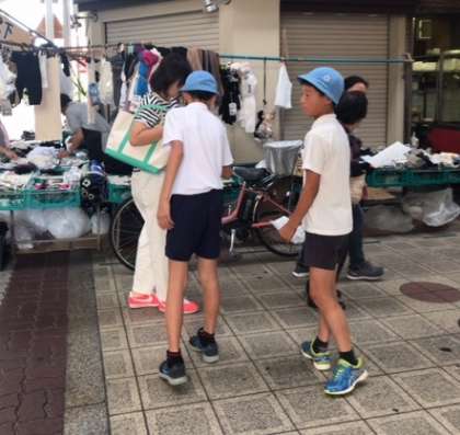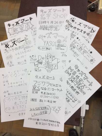 今日は、6年生が手作りのチラシを配って、来週の火曜日(9/26)に行われるキッズマートの宣伝活動を行いました。例年大盛況のキッズマート。新鮮な野菜や洗剤、タオル類などいろいろな商品を売っています。是非、買い物に来てください。時間は、午前10:00〜11:30です。