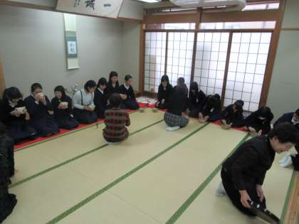 お茶室の生け花や掛け軸、お抹茶についての知識や、入れ方・いただき方を教えてもらい、自分でお茶を点てました。細かな作法や触ったことのない道具に、恐る恐るといった様子も見られましたが、みんな真剣に取り組んでいました。出来上がったお茶の苦さに驚きながらも、最後までいただきました。普段なかなかできない貴重な体験をさせていただきました。