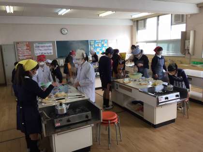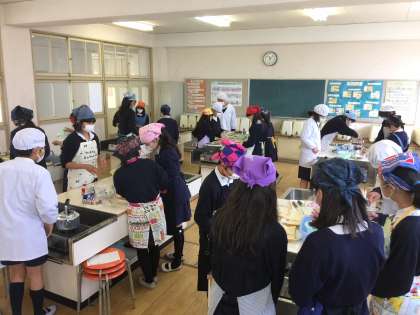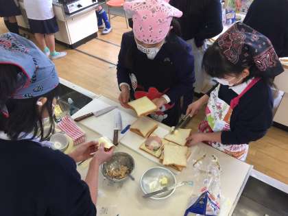 今日は、6年生が最後の調理実習をしました。メニューはサンドイッチと紅茶です。グループでハムサンド、ツナサンド、卵サンドを作りました。材料の切り方を工夫したりゆで卵をちょうどよいかたさに作ったりし、みんなで協力して取り組むことができました。でき上がったサンドイッチは、紅茶とよく合ったようで、どの班もとてもおいしそうに食べていました。