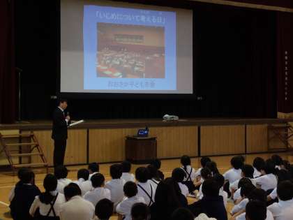 児童朝会で校長先生から、「いじめについて考える日」について話がありました。