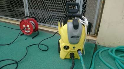 本日は、管理作業員さんが2台の高圧洗浄機を駆使して、1年間のプールの頑固な汚れをきれいに落としてくれました。