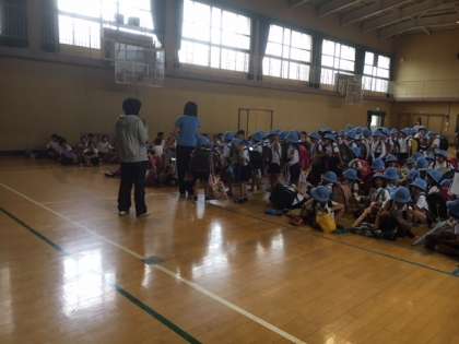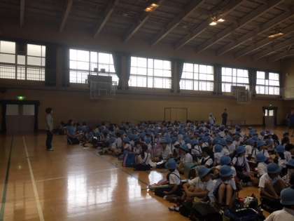 学校では、登校時の安全確認を行うと共に、登校後講堂に集まって全校児童の無事を確認しました。そして、余震に注意するよう改めて指導を行いました。
