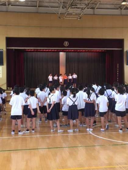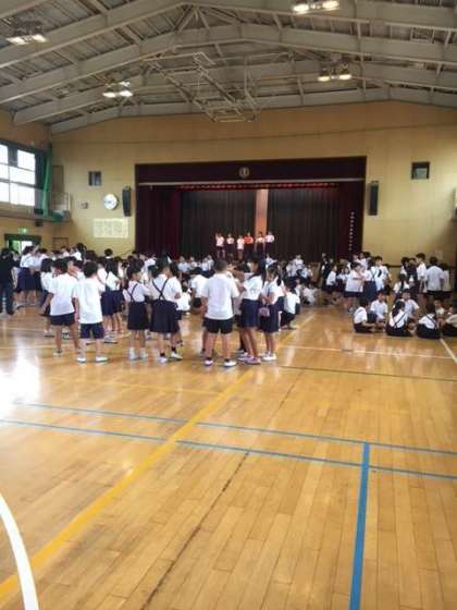 今朝は、集会委員会の児童による「人数集めクイズ」でした。集会委員会の児童が数の問題を出し、その答えを考えてその人数が集まって答えます。色々な子と触れ合える楽しいゲームでした。
