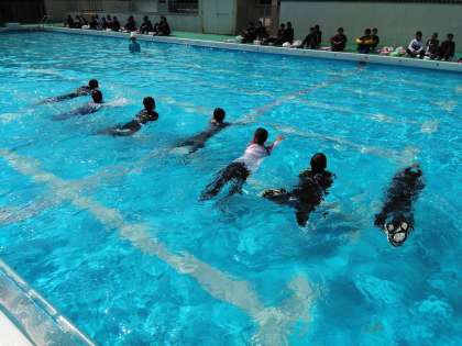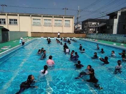 今日は6年生が着衣をしたままで、プールで学習をしました。着衣のままで泳ぐとこんなに抵抗感があって泳ぎにくくなるのかを体験するのと同時に、ペットボトルを使って水に浮くことで溺れたりした時の対処の仕方を学習しました。