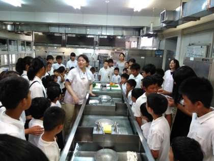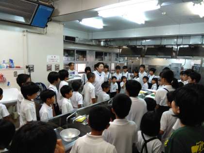 給食調理室は普段は中を見ることはできないのですが、今日は給食調理員さんのご厚意により、中を見せていただくことになりました。6年生が1年生を引率して給食室内を見回りました。6年生には代表者に釜へ水を大きなおたまで入れる体験などをしてもらいました。子どもたちはそれぞれで給食の調理の実際を知り、新しい発見をしていました。