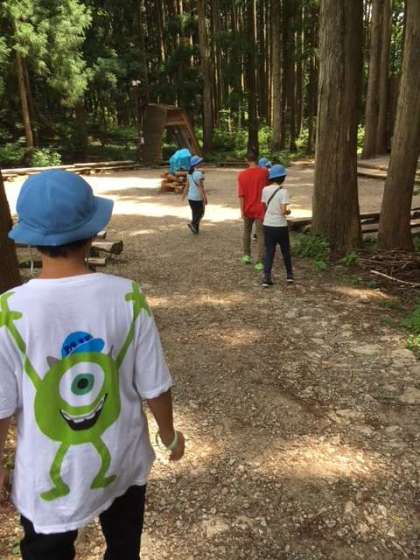 部屋割・避難訓練の後、宿舎裏の森で食材探しゲームを始めました。