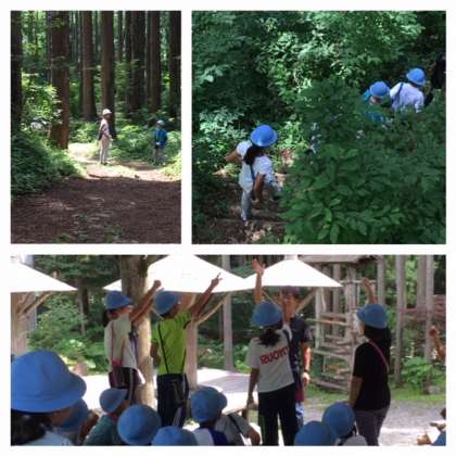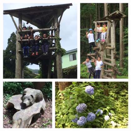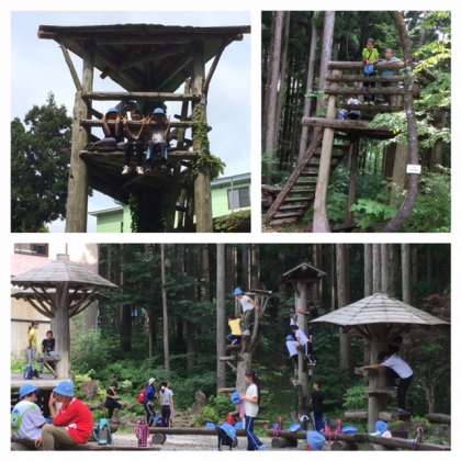 森の中にはたくさんのアスレチックがあります。子どもたちは、高いところに登るのが大好きです。