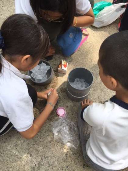 筒の容器にそのアルミ缶と氷、食塩を入れます。