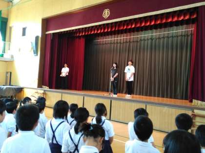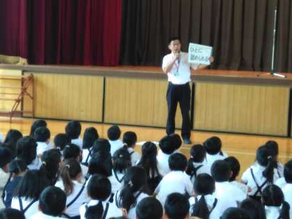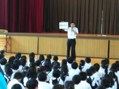 台風が過ぎ去り、今日は2時間遅れての始業となりました。児童朝会では、校長先生から「いじめをなくす」ために「みんなでよい所を『認め合う』こと、そしてお互いに『認めてもらう』ことが大切です。」というお話をしてただきました。お互いの良さをみんなで認め合える学級や学年になっていってほしいですね。また、教育実習生の先生が明日2日で最終日となるのでお別れの挨拶をしてもらいました。