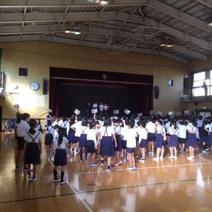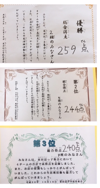 今朝の児童集会で、先週行った東田辺っ子集会の得点発表がありました。得点の多かった三つのチームが表彰されました。優勝したのは、2班でした。2班のみなさんは、協力してたくさんのお店を回り、得点が多く取れるように工夫していたそうです。