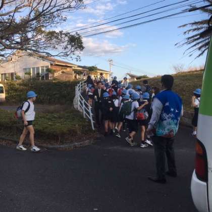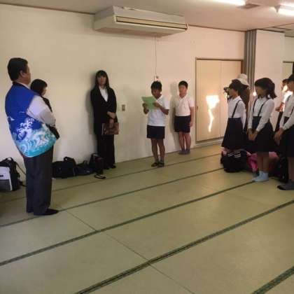 ともやま観光ホテルに着き、開舎式と部屋割、避難訓練をしました。この後、お風呂とお土産タイムに本館まで行きます。