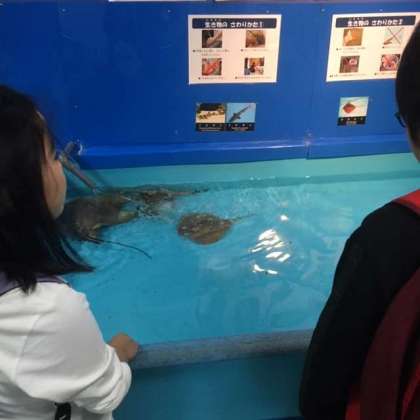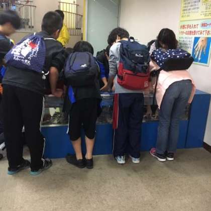 生き物に触れるコーナーには、多くの子が集まっていました。最後にお土産を買って宿舎に戻りました。