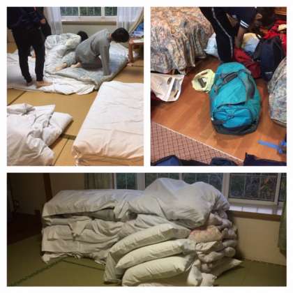 おはようございます。今朝は、とても良いお天気です。6時に起床し、布団をたたみ荷物を整理しました。