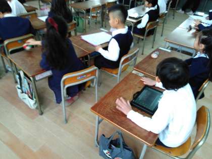 1年2組の福井学級にてICT機器を使って授業をしてもらい、教員に公開して研究活動を行いました。内容は生活科で教材名は「昔から伝わる遊びをたのしもう」です。けん玉やお手玉など、様々な遊びを経験している子どもたちが、タブレットを使って遊びについて調べたことを発表する内容でした。1年生の子どもたちでも学習していくとタブレットが上手に使えるようになるのですね。発表ノートや動画の機能を上手に活用した授業でした。授業後は教員間で授業の反省や検証をする研究会を行いました。さらにICT機器を使った実践や研究を学校としてすすめていきたいと思います。