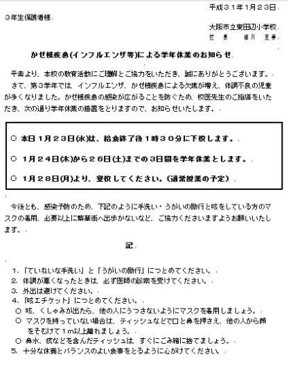 3年生でインフルエンザA型による欠席が多くなり、明日24日(木)から26日(土)までの3日間、学年休業の措置をとることになりましたのでお知らせします。