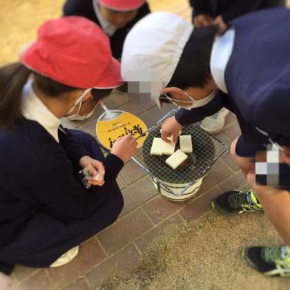 各班で炭の火をおこして、網を使って餅を焼きました。火をおこすのが難しそうでしたが、その後は、上手に焼いて、美味しくいただいていました。