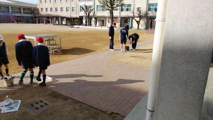 午前中、3年生が総合の時間に運動場で七輪体験をしていたので、一緒に炭をおこしてお餅を焼いていました。