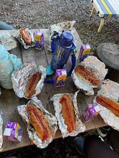 きれいに焼き上がったホットドッグにケチャップをつけて食べます。一人にホットドッグ2つずつとブドウジュースをいただきます。子どもたちは、とても喜んで食べています。