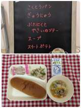 ☆黒糖パン ☆牛乳 ☆豚肉と野菜のソテー ☆スープ ☆スイートポテト 「豚肉...