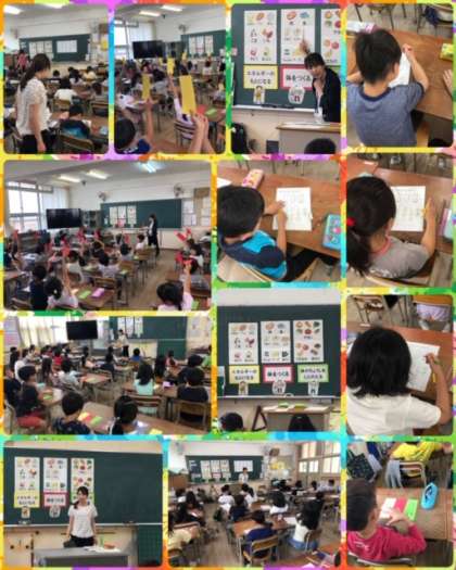 代谷先生が用意してくれた色別カードを使って、クイズ形式でこの食べ物はどのグループに入るのかを考えました(^o^)