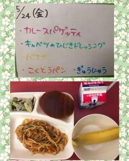 『カレースパゲティ』は、豚ひき肉を主材に、ベーコンで旨味を増し、カレールゥなどで味付けした子ども達に大人気の献立です☆☆☆